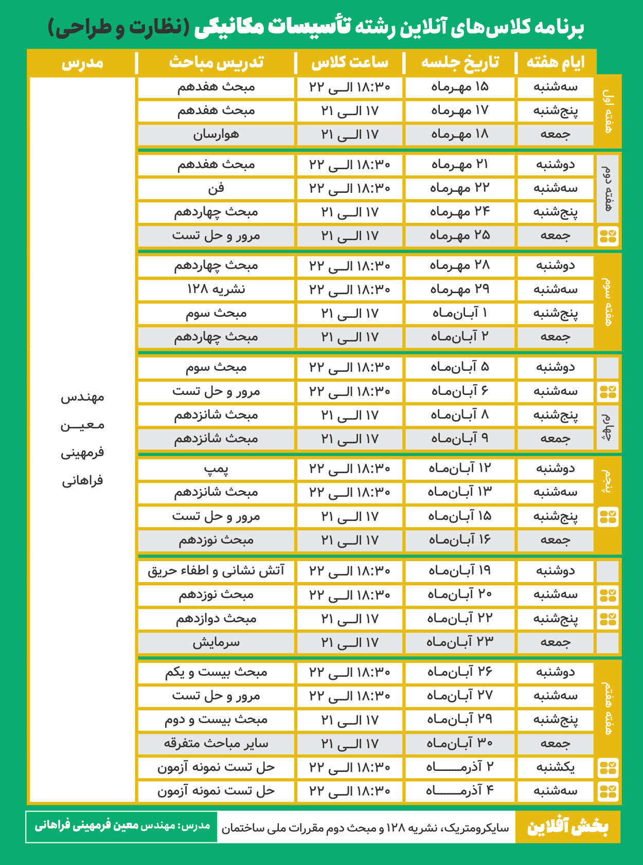 با توجه به برگزاری آزمون نظام مهندسی در تاریخ ۶ و۷ آذر ۱۴۰۴، شروع کلاسهای آنلاین مکانیک در چه تاریخی، چند روز در هفته و در چه ساعاتی برگزار میگردد؟ مدت زمان هر جلسه چقدر است؟